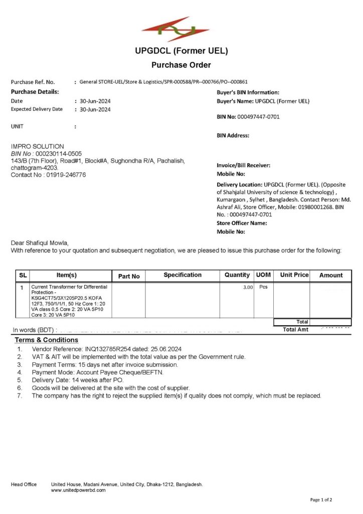 The client was UPGDCL (Former UEL), Bangladesh. The project started as a trial order, because the client had previously imported similar items from overseas through Letter of Credit (LC). After successful supply and service support from our side, the client placed repeat orders.