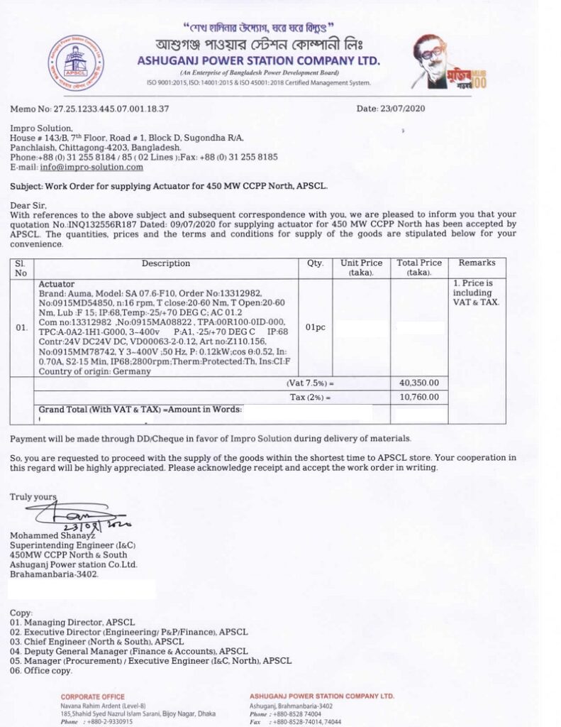 Ashuganj Power Station Company Ltd, Bangladesh issued a work order for supplying an actuator for 450 MW CCPP North on 23 July 2020. The client required a genuine AUMA actuator for a critical plant application, with full confidence on originality and correct specification.